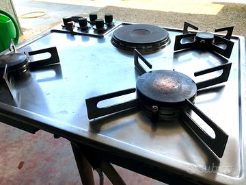 Piastra fuochi professionale Alpes Inox 58x50cm di cui tre fuochi a gas con valvole di sicurezza a spegnimento automatico e uno con piastra elettrica a induzione ideale sia per per cucina industriale di ristorante, che per uso domestico, incluso di presa elettrica a scomparsa "magic" vendo a 139 euro.