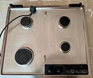 Piano cottura da incasso REX serie PX, 4 fuochi, in acciaio satinato. il piano è completo del suo coperchio originale in vetro temperato nero e le relative piastre e griglie nere. Misure esterne standard 60x51cm Foro incasso standard 56x48cm Sicurezza dotato di termocoppie Accensione elettrica integrata nelle manopole Stato usato ma ben tenuto, griglie in smalto nere integre, manopole originali e cerniere del coperchio perfettamente funzionanti. Incluso cavo con spina standard per l'accensione.