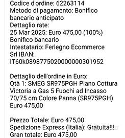 Vendo piano cottura smeg, causa cambio cucina, acquistato a marzo 2025 ed utilizzato pochissimo.