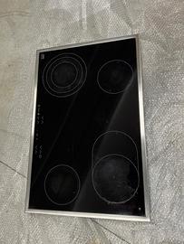 Piano cottura in vetroceramica AEG con 4 zone di cottura, di cui una a doppio circuito. Comandi touch frontali e superficie in vetroceramica nera,