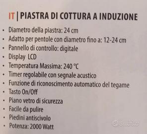 8 livelli di potenza - spegnimento automatico. Con display digitale e potenza 2000W. Questa piastra ad induzione indipendente è facile da usare, si riscalda molto rapidamente ed è quindi rispettosa dell'ambiente. Dotato di un 180min. funzione timer. Diametro della piastra di cottura 24cm, temperatura massima 240°C. nuova, nella confezione originale. Da retirare a Grottaglie
