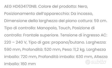 Vendo piastra da incasso AEG mod HD634170NB. nuova a 4 fuochi: 2 a induzione e 2 a gas. Dimensioni piastra mm 520 x 590