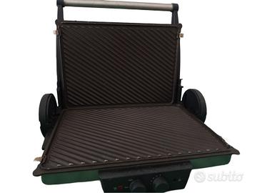 Comodissima, Funzionante e ben tenuta e con manico ergonomico per una presa sicura. Senza scatolo e con coppette raccolta liquidi di cottura. Teglia e doppia piastra con scalanatura liscia e superficie di cottura antiaderente. 220-240 V 2000 watt 50-60 Hz.