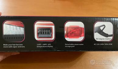Piastra capelli in nano-ceramica a vapore generatrice di ioni con tecnologia PTC con possibilità di inserire acqua nel relativo vano superiore (con meccanismo di bloccaggio sicuro) che poi si trasformerà in vapore che uscirà in quantità limitata per non far bagnare i capelli ma anche in quantità sufficiente a rendere i capelli ancora più lisci e assicurare la tenuta più a lungo.