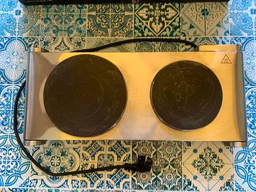 Piastra cottura Ariete con 2 fuochi di diametro 155cm e 188cm. La temperatura di ciascun fuoco è regolabile tramite apposite rotelle dotate di spia di accensione.