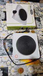 È una piastra in ghisa del diametro 18,5 cm con termostato regolabile, indicatore luminoso di funzionamento. È stata usata a casa solo una sola volta per provarla, è comodissima in giardino, in campeggio e in un qualunque luogo in cui ci sia una presa elettrica.