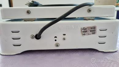 Piastra elettrica portatile, in alluminio e ceramica bianca.. Potenza: 1000watt. Pratica e comoda.