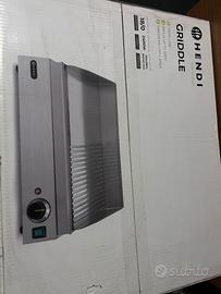 Piastra griglia 1/2 liscia e 1/2 rigata (518x330 mm). Presenta una piastra in acciaio temperato di 8 mm di spessore per un'uniforme distribuzione del calore. Temperatura regolabile fino a 300° C. Facile da pulire con paraspruzzi e vassoio raccolta grassi. Nuova mai usata