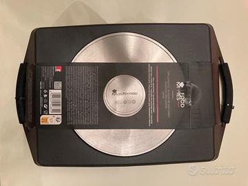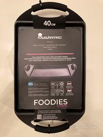 Pratica e robusta piastra grill firmata Masterpro, ideale per grigliare carne, pesce o verdure, garantendo una cottura sana e uniforme. Realizzata in alluminio con rivestimento interno antiaderente in Whitford Quantanium, doppi manici con rivestimento in silicone. Fondo full induction, compatibile con tutti i piani cottura, induzione inclusa. Dimensioni: 40x24cm. Nuovissima mai usata, in confezione originale