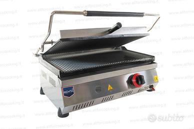 Schiaccia panini professionale a GAS con piastra rigata in ghisa. Struttura in acciaio inox e maniglia di plastica resistente al calore. Manopola di regolazione potenza fiamma. Canalina di scolo estraibile. Cutter automatico a gas con sistema di sicurezza. Cell: 3202314412 Specifiche tecniche: Alimentazione: gpl o metano (kit su richiesta) Dimensioni prodotto: 50x43x27 cm