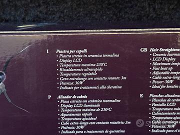 Piastra per capelli professionale Exalta con piastre in ceramica tormalina Display LCD Temperatura massima 230° Riscaldamento ultrarapido Temperatura regolavile Cavo extralungo rotante: 3 metri Potenza 30w Indicato per trattamenti alla cheratina