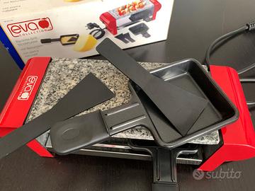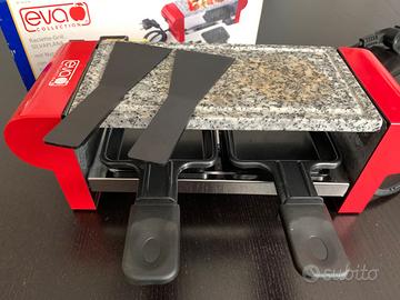 Piastra elettrica con pietra naturale in granito per grigliata e padelline antiaderenti per formaggio raclette, adatta a due persone. Sulla pietra si cuociono la carne e le verdure, sul ripiano sotto si scalda il formaggio. Molto divertente, si può usare anche sul tavolo. Consumo limitato di corrente, solo 350 w, però cuoce bene! Facile da usare e da pulire, bella da vedere, usata pochissimo, quasi come nuova, la piastra ha un alone, vedere foto.