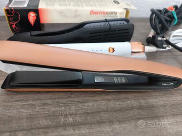 Piastra Sinelco Ultron Elite Styler Natural Rose, Le piastre hanno un rivestimento ceramico in nanodiamante, che consente loro di scivolare tra i capelli senza sforzo. Regolazione della temperatura 180°-210°-230°C, riscaldamento rapido in 15 sec. Chiusura in gomma soft. Spazzola Stirante Denman, descrizione così come da confezione: "Il sistema più dolce e veloce per stirare i capelli durante l'asciugatura a phon. Le piastre in termo-ceramica assicurano una libera circolazione dell'aria per un'asciugatura più rapida. Le setole naturali di cinghiale danno lucentezza e sostanza al capello per un aspetto setoso e morbido. Manico soft-touch per maggiore confort durante l'uso " Inclusa, mini piastra da viaggio o per chi porta i capelli corti, temperature gradi: 160, 190, 220