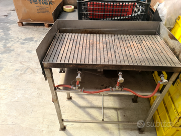 Piastre con struttura in acciaio, pietra sagomata e scanalata, 3 fuochi a gas gestibili singolarmente, utilizzate 1 volta l'anno, smontabili per trasporto. Da rifare collegamenti.con tubo nuovo di giunzione valvole.