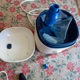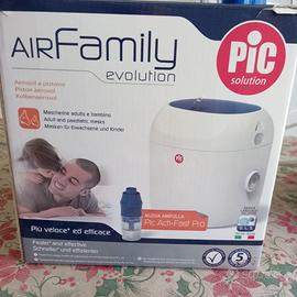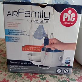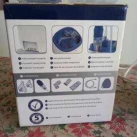 aerosol a pistone, disegno ergonomico e semplice, compatto, veloce ed efficace, a corredo 2 morbide mascherine x adulti e bambini anche neonati, vano porta accessori e porta ampolla integrata. Apparecchio testato dall' Università di Parma Dipartimento Farmaceutico