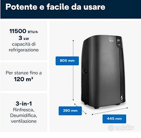 De'Longhi PAC EX120 Silent Pinguino Climatizzatore Portatile REAL FEEL, 11.500 Btu/h, Timer 24H, Display LED, 3 Velocità di Ventilazione, Termostato, Ruote e Telecomando, Nero, 80.5 x 44.5 x 39 cm