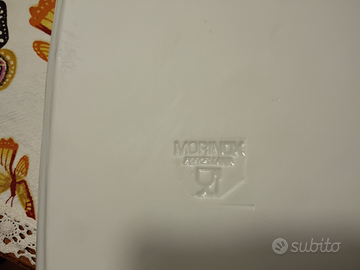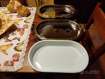 Pirofila in porcellana 33 cm, due vassoi a incastro in acciaio inox, utilizzata solo una volta, ancora in ottime condizioni