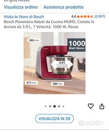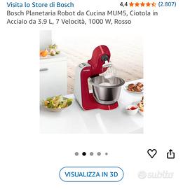 Bosch Planetaria Robot da Cucina MUM5, usata due volte connparti ancora imbustate. Ciotola in Acciaio da 3.9 L, 7 Velocità, 1000 W, Rosso, ciotola in acciaio inox da 3, l, gancio per impasti duri, frusta per impasti morbidi e frusta in acciaio inox per montare tutti gli ingredienti, taglierina con 3 dischi, bicchiere frullatore in plastica 1, 5 l, Custodia, coperchio trasparente, DVD di ricette Accessori inclusi: * Ciotola in acciaio da 3,9 l - per lavorare fino a 2,7 kg di impasto per torte o 1,9 kg di impasto da lievitare * Gancio per impasti duri, frusta per impasti morbidi e frusta in acciaio inox per montare tutti gli ingredienti * Taglierina con 3 dischi * Bicchiere frullatore in plastica 1,25 l * borsetta in dotazione per le fruste * Coperchio trasparente * DVD di ricette incluso