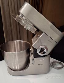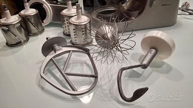 Questa Kenwood Major Premier modello KMM770, è composta da diverse parti, completamente smontabili per permetterne una pulizia agevole. Corpo in acciaio e alluminio pressofuso, include due fruste – la frusta K e la frusta a filo –, il gancio impastatore per grandi lievitati, il Frullatore Thermoresist KAH357NS. Dotato di accessorio tagliaverdure con pestello in plastica e 5 rulli monotaglio in metallo a bassa velocità per sminuzzare, tagliare, grattugiare fine e grosso, ottimo per tagliare frutta e verdura, grattugiare formaggi stagionati, sminuzzare nocciole o cioccolato. Il tagliaverdure non è mai stato usato. La planetaria è dotata di presa tedesca Schuko.