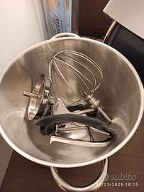 Completa di 2 ciotole per impasto (una acciao ed una plastica), 4 fruste per diverse tipologie di impasto. Fornita inoltre di frullatore, affettatore/tritatore con 6 tipologie di lame per differenti tipologie di taglio.