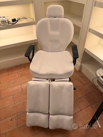 Poltrona idraulica girevole e inclinabile da estetista con gambali separati, colore bianco, perfettamente funzionante, usata solo due mesi