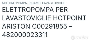 Pompa di carico acqua per LAVASTOVIGLIE Ariston Hotpoint , pagata 65, vendo per errato acquisto, montata sulla lavastoviglie ma il guasto non era quello quindi rimossa. praticamente nuova