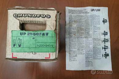 Pompa di circolazione Grundfos UP 21-50 F&V. Mai usata, con scatola originale e istruzioni. Modello distribuito in Italia dalla Majmar di Milano prima della fondazione ufficiale di Grundfos Pompe Italia nel 1987. Perfettamente conservata.