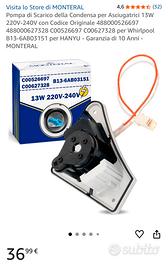Vendo pompa di scarico condensa per asciugatrici 13W 220-240V L’oggetto è nuovo e non e mai stato usato, vedere la foto di riferimento amazon per i modelli e codici compatibili