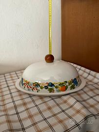 Elegante e pratico portavivande in ceramica bianca con decorazioni floreali e frutta colorati. Include un piatto ovale bianco, coperchio bombato con pomello in legno. Perfetto x conservare e x servire. Articolo fatto a mano. CERAMICHE ARTISTICHE NUOVA CERAMICA