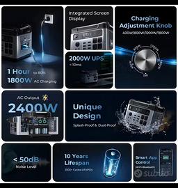 vendo powerstation nuova marca OUKITEL modello P2001E plus offre un'uscita di 2400w e possiede una batteria con tecnologia lifepo4 da 2040wh dispone anche si collegamento tramite bluetooth per il controllo da remoto della carica e dei principali parametri Per il ritiro sono disponibile a Bologna o Cesena, saltuariamente passo anche da Ancona. sono disponibile a fermarmi nelle città di strada tra queste città.