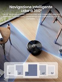 NUOVO NELLA SUA CONFEZIONE ORIGINALE Proscenic Q20 Plus Robot Aspirapolvere Lavapavimenti con Mappatura 10000Pa, 200 Minuti Autonomia, Senza Sacco, con Stazione per Tappeti/Pavimenti Stazione di Svuotamento Automatico Senza Sacco: Fino a 90 Giorni Senza ManutenzioneDopo ogni ciclo di pulizia, il robot svuota automaticamente il contenitore della polvere nella base da 4L in soli 10 secondi — non devi toccare lo sporco affatto. Il design senza sacchetto elimina i costi dei ricambi (come i sacchetti di ricambio) e riduce l’inquinamento ambientale. Inoltre, il serbatoio è facilmente lavabile, mantenendo sempre l’ambiente igienico e privo di odori sgradevoli. Potenza di Aspirazione da 10000Pa: Pulizia Efficace Senza Rumori fastidiosiIl Proscenic Q20 Plus, dotato di un motore brushless ad alte prestazioni, garantisce una potenza di aspirazione fino a 10.000Pa — sufficiente per aspirare polvere, briciole, capelli e persino detriti piccoli senza sforzo. Offre 3 impostazioni di aspirazione per ogni esigenza: modalità silenziosa (solo 60 dB, come il rumore di un libro che si legge), modalità standard e modalità potente. La modalità silenziosa è perfetta per famiglie con neonati, anziani o animali domestici, perché permette di pulire senza disturbare le attività quotidiane. Sistema 3 in 1: Spazzare, Aspirare e Lavare — Tutto in Un DispositivoIl Proscenic Q20Plus unisce tre azioni di pulizia in uno: prima spazza via lo sporco superficiale, poi aspira polvere e detriti piccoli, infine lava per eliminare macchie tenaci. Con 3 regolazioni del flusso d’acqua, puoi adattare l’umidità del panno a ogni pavimento (come legno, ceramica o lino), evitando eccessi d’acqua che causano aloni o danni. Inoltre, la modalità di pulizia a matrice copre ogni angolo e rimuove lo sporco incastonato, lasciando i pavimenti lucidi e igienici. Batteria a Lunga Durata: Copertura Dotato di una batteria ad alta capacità, il robot lavapavimenti aspirapolvere copre fino a 230 m² in una sola ricarica