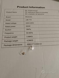 Pulitore per tappeti Pexcho JJB-718, 550W potente , 18kPa, 220-240V, 50-60Hz - NUOVO imballato