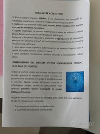 Informare, rivitalizzare, ionizzare e magnetizzare l'acqua da bere. I magneti in Neodimio riducono la possibilità di aggregazione dei sali minerali presenti ed il percorso a "esse" del revitalizzatore PLEIADI serve alla creazione di turbolenza nell'acqua.