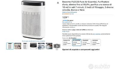 Rowenta PU2530 Pure Air Essential, Purificatore d’aria, elimina fino al 99,9%, purifica una stanza di 10 m2 in soli 7 minuti, 3 livelli di filtraggio, 3 diverse velocità, Bianco e Nero.