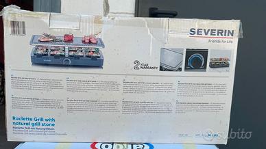Raclette con grill in pietra naturale con 8 pentolini per raclette, rivestimento antiaderente. Manopola con spia di controllo. Dimensioni approssimative dell'intera griglia: 46 x 23 cm. Ottime condizioni, usato una sola volta. No spedizione, solo consegna a mano in zona.