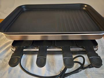 Raclette - grill da tavolo, con temperatura regolabile, per grigliare carne, pesce, verdure, formaggio. Dotata di 8 padelle indipendenti per diversi cibi. Facile da pulire perché la piastra è staccabile, come le padelle. Usata solo una volta.