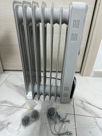 Radiatore a olio con 7 elementi, 3 livelli di potenza (600/900/1500W) e sistema di sicurezza anti-ribaltamento.