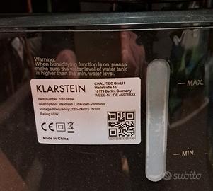 Marca Klarstein Maxfresh è il raffreddatore evaporativo che funziona da umidificatore, ventilatore e rinfrescatore. È dotato di pannello di controllo e di telecomando per regolare il flusso d'aria. Ha quattro velocità di ventilazione, un'oscillazione orizzontale attivabile e il timer di spegnimento che si può impostare fino a 15 ore. L’effetto rinfrescante viene ulteriormente intensificato tramite il principio di evaporazione dell'acqua: il dispositivo aspira aria calda dal retro e la umidifica; il serbatoio ha una capacità di 6 litri e 2 siberini per un funzionamento prolungato, potenza assorbita di soli 65 Watt, usato 2 mesi circa, istruzioni in italiano.