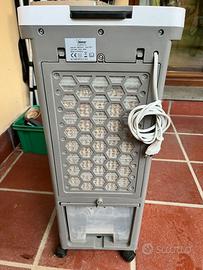 Raffrescatore, Purificatore, Ventilatore elettronico Comandi elettronici e Telecomando LEDs visualizzano le funzioni in uso 3 velocità: Min / Med / Max 3 modalità: Normal / Natural / Sleep Griglia frontale con regolazione Alto/Basso e oscillazione automatica Destra/Sinistra Timer 7h Serbatoio 7L., trasparente, apertura a cassetto e con fermo Pompa pescaggio acqua Visualizzatore frontale del livello acqua 2 panetti di ghiaccio in gel Filtro ad alveoli in cellulosa, lavabile Filtro aspirazione lavabile Corpo in plastica e base con ruote piroettanti 220-240V~ 50Hz 80W