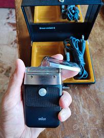 rasoio elettrico vintage anni 70 perfettamente conservato e funzionante con cavo per la corrente elettrica, pennello per pulire e astuccio da viaggio con vetro all'interno.