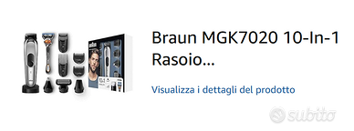 Rasoio Braun MGK7020 con diverse testine di regolazione per barba e capelli. Perfettamente funzionante, vendo per sostituzione con nuovo modello. Compreso di carica batterie. Manca scatola.