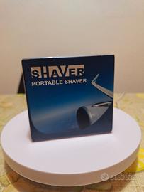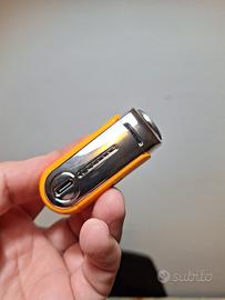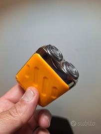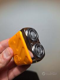 Rasoio elettrico portatile con finiture argentate e corpo arancione brillante. Ideale per ritocchi veloci.