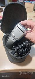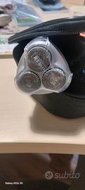 Rasoio elettrico con finiture in nero e argento, completo di custodia e cavo di ricarica.