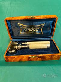 L'oggetto è un rasoio vintage Mondesir Vibrator, un esempio affascinante di come la tecnologia per la cura personale si sia evoluta nel XX secolo. Sebbene il nome possa trarre in inganno oggi, all'epoca questi dispositivi erano commercializzati come strumenti innovativi per una rasatura più profonda ed efficace. Il termine "Vibrator" si riferiva spesso a meccanismi che creavano micro-vibrazioni o movimenti oscillatori della testina per aiutare a tagliare piu in profondita il pelo. Il set si presenta in una custodia rigida con finitura marmorizzata (effetto bachelite o celluloide) e interno in velluto blu, tipico degli oggetti di lusso della prima metà del Novecento. La confezione contiene il manico in metallo con impugnatura zigrinata per una presa sicura e la testina del rasoio di sicurezza.