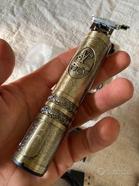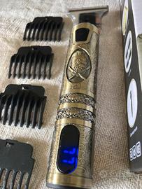Bellissimo rasoio elettrico da barbiere stile vintage con incisioni. Con la sua scatola originale, custodia protettiva e completo di tutti i suoi accessori: 4 calibri di spessori diversi, cappuccio protettivo, pennellino per pulizia, libretto di istruzioni, e cavo ricarica usb. In Condizioni perfette, batteria al 100% così come le funzionalità. Con Display digitale che indica il livello di carica.