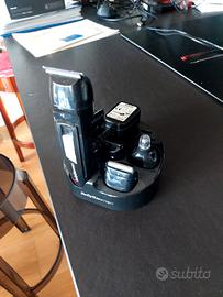 regola barba e capelli nero completo di tutti gli accessori per varie misure, contorni barba e basette e baffi, doppia testina per barba e capelli, oltre a testina per regolare peli di naso e orecchie. incluso carica batterie e set per pulizia testine.
