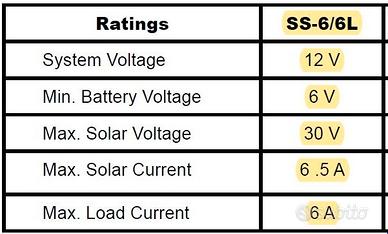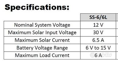 Vendo Regolatore di carica fotovoltaica Morningstar SunSaver Mod. SS-6L-12V ideale per piccoli impianti fotovoltaici con batterie sigillate o convenzionali, praticamente nuovo, causa inutilizzo. Disponibile il manuale completo di installazione ed utilizzo in formato pdf.