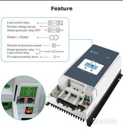Attenzione: vendo questi articoli perché tra qualche mese mi trasferirò all’estero. I prezzi sono già stati fissati in modo onesto, competitivo e ribassato proprio per agevola Regolatore di Carica Solare EPEVER MPPT 60A-6415AN 12/24/36/48V Il regolatore MPPT della serie Tracer è adatto a diverse applicazioni solari off-grid. 12 V / 24 V / 36 V / 48 V CC (sistemi per veicoli) Corrente di carica nominale: 60 A Potenza massima in ingresso: 750 W – 3000 W (750 W/12 V, 1500 W/24 V, 2250 W/36 V, 3000 W/48 V) Tensione massima a circuito aperto: 150 V CC (138 V a 25 °C) Selezione del tipo di batteria: piombo-acido (Gel, AGM/Sealed/Utente/LiFEPO4), batterie a elettrolita liquido (Flooded) e impostazione utente Regolatore con polo negativo comune. Tensione di ingresso batteria: 8 V ~ 68 V Programmabile dall’utente per tipi di batteria, controllo del carico, ecc. Contenuto della confezione: 1 × regolatore di carica solare Tracer 6415AN 1 × manuale utente (lingua inglese non garantita) Regolatore di carica MPPT Tracer 6415AN Nota importante: Procedura di collegamento: collegare il sistema nell’ordine 1. batteria → 2. carico → 3. campo fotovoltaico (PV), e scollegarlo in ordine inverso 3 → 2 → 1. La batteria deve essere collegata per prima!!! Non collegare mai il campo fotovoltaico al regolatore senza o prima di aver collegato la batteria. Non collegare inverter, generatori eolici, alternatori o caricabatterie al regolatore di carica. Se il sensore di temperatura remoto non è collegato al regolatore, la temperatura predefinita per la carica o la scarica della batteria è impostata a 25 °C, senza compensazione della temperatura. La sezione dei morsetti è indicativa. Se la distanza tra il campo fotovoltaico e il regolatore o tra il regolatore e la batteria è elevata, è possibile utilizzare cavi di sezione maggiore per ridurre la caduta di tensione e migliorare le prestazioni. Oggetto usato un mese, vendo per passaggio a sistema ibrido completo a 48 volt.