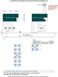 DOMUPLUS consente di intervenire sugli impianti tradizionali senza l'aggiunta di cablaggio, ma sfruttando quello dell'impianto esistente, indipendentemente dalla serie civile installata!, ANCHE su quegli impianti dove i wireless non funzionano. L'unica condizione indispensabile è che sia presente l'alimentazione elettrica, (fase e neutro). I micromoduli entrano anche nelle vecchie scatole da incasso 502. E' possibile realizzare dei sistemi equivalenti a quelli con relè passo passo ma con due soli fili. La tecnologia implementata di tipo PROPRIETARIO, unica e originale, oltre alla stabilità ed affidabilità, consente una portata elevata. NON è X10 !!! Nessun falso positivo o necessità di installare alcun filtro sull'impianto! I dispositivi funzionano anche se alimentati da inverter e in presenza di dispositivi powerline HomePlug AV, senza interferenze. In ambito anti intrusione presenta caratteristiche anti jammer!!! Domuplus è un sistema di tipo proprietario ad onde convogliate (powerline) che non richiede l'installazione di filtri, ideale per gestire tutte le funzionalità del vostro impianto elettrico su tutti i livelli, da quello classico fino a quello domotico incluso sistemi di sicurezza, anche dove i wireless non funzionano e tirare cavi è troppo problematico. Domuplus si applica indipendentemente dalla serie civile installata! I micromoduli entrano anche nelle vecchie scatole da incasso 502. Centinaia di dispositivi installati dal 2010 ad oggi senza problemi!!! Domuplus con marchio CE è conforme alla normativa vigente . Nel caso più semplice ed economico si ha un trasmettitore (Domuplus comando) e un ricevitore (Domuplus attuatore), ma è possibile avere innumerevoli trasmettitori e ricevitori contemporaneamete sulla stessa linea. E' possibile realizzare degli impianti di illuminazione funzionanti in modo analogo ai relè passo passo con in più la possibilità di dimming con gli appositi attuatori (on/off e on/off + dimmer). Si possono installare campanell