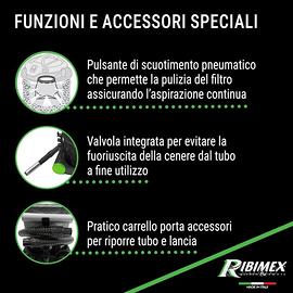 Funzione soffiante integrata: la funzione permette di usare il dispositivo non solo per aspirare, ma anche per soffiare aria; è utile per rimuovere la cenere da angoli difficili, rendendo l'aspiracenere più versatile per la pulizia